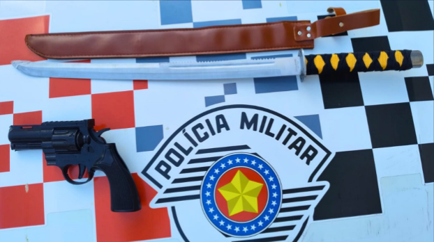 Na residência, os policiais encontraram uma espada japonesa e um simulacro de revólver. Os objetos foram apreendidos e encaminhados à delegacia.
